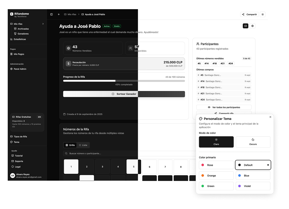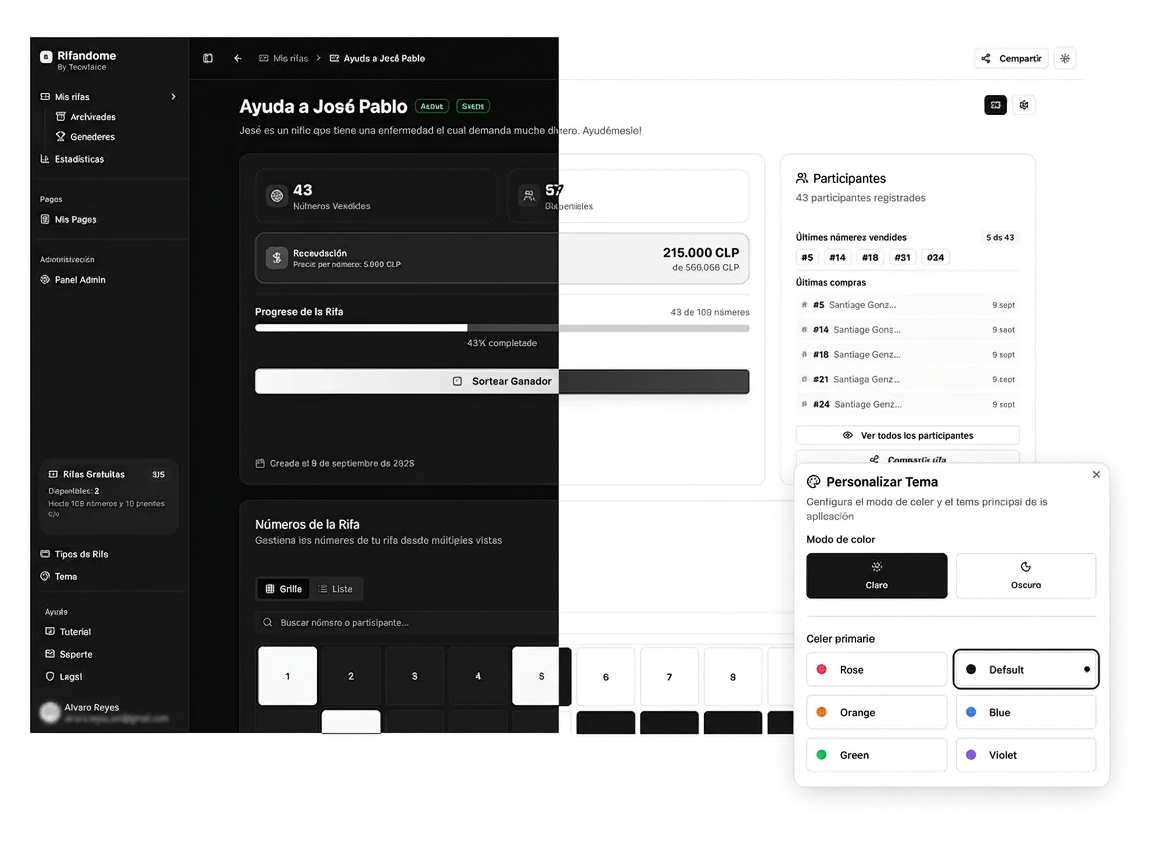 Elige entre 6 paletas de colores y un modo oscuro elegante para que tus rifas luzcan únicas y se adapten a tu identidad.