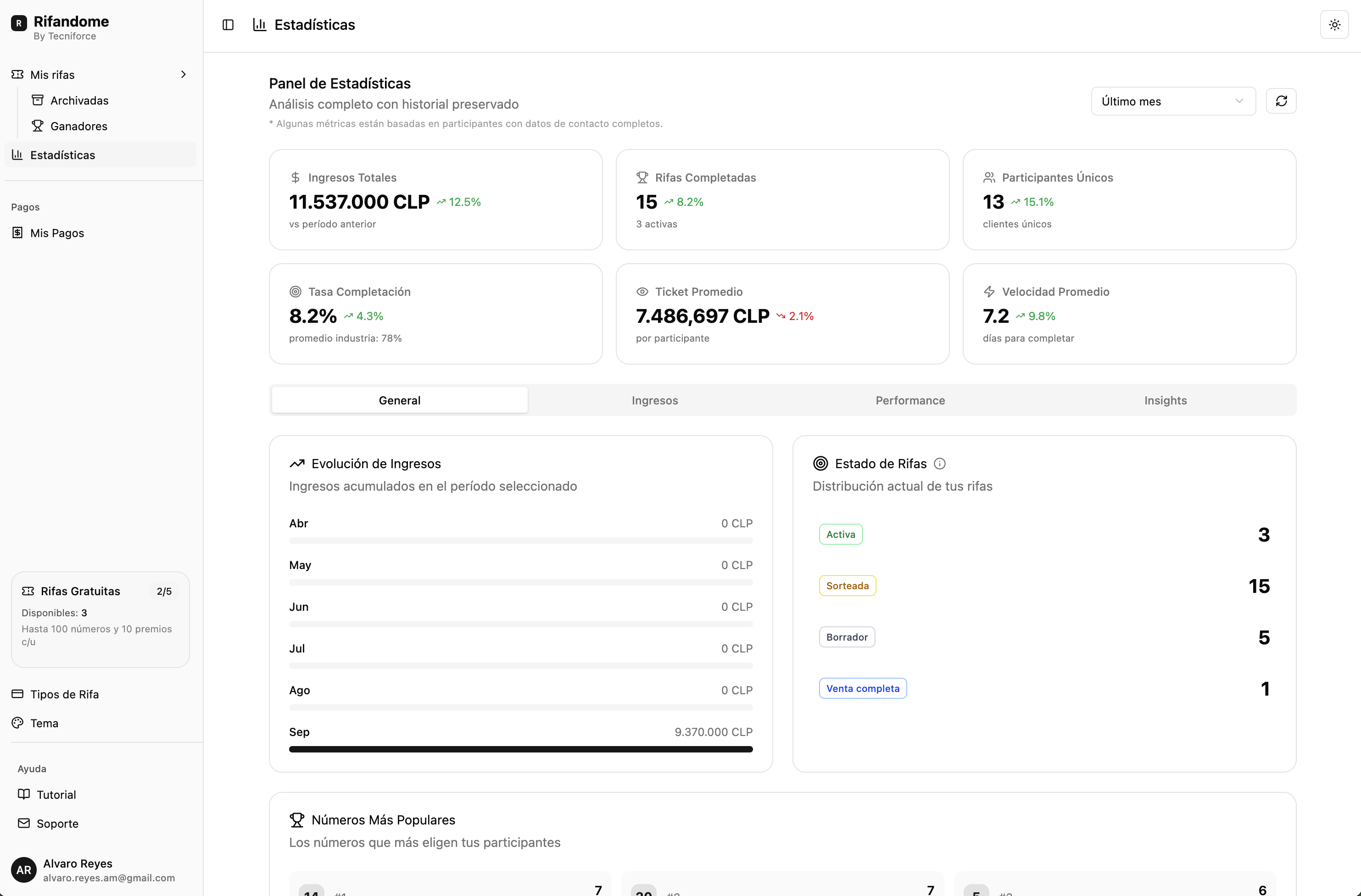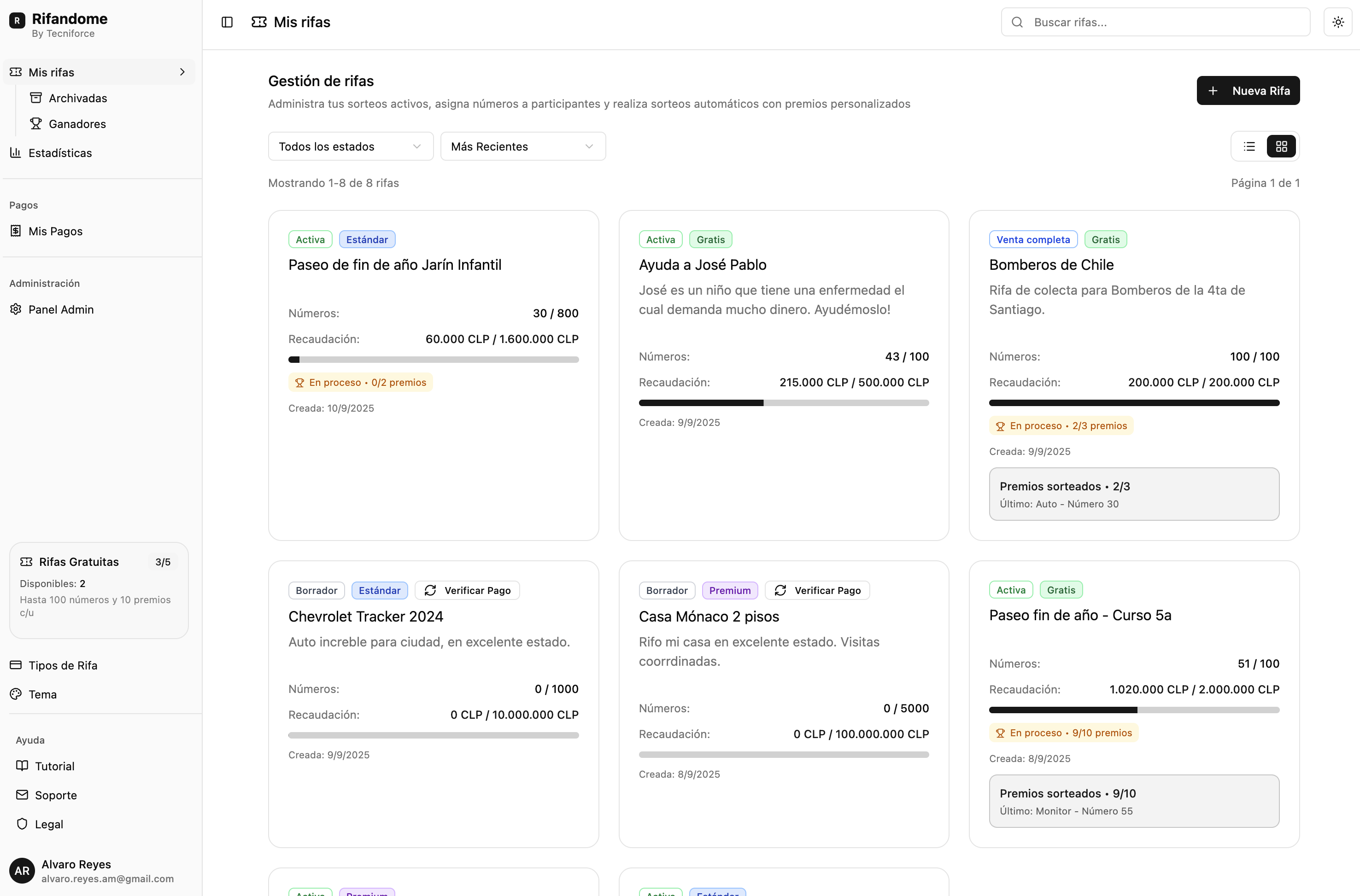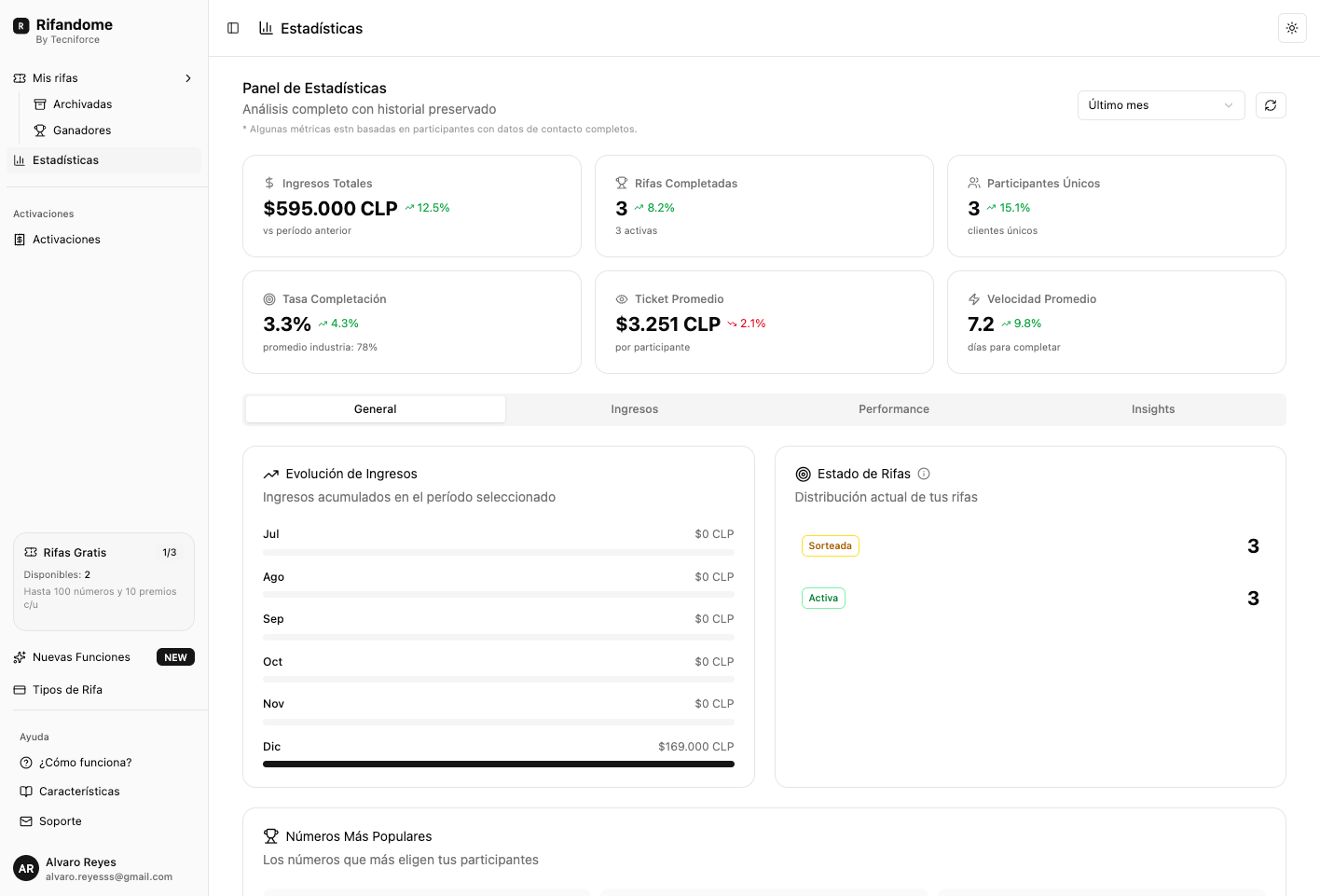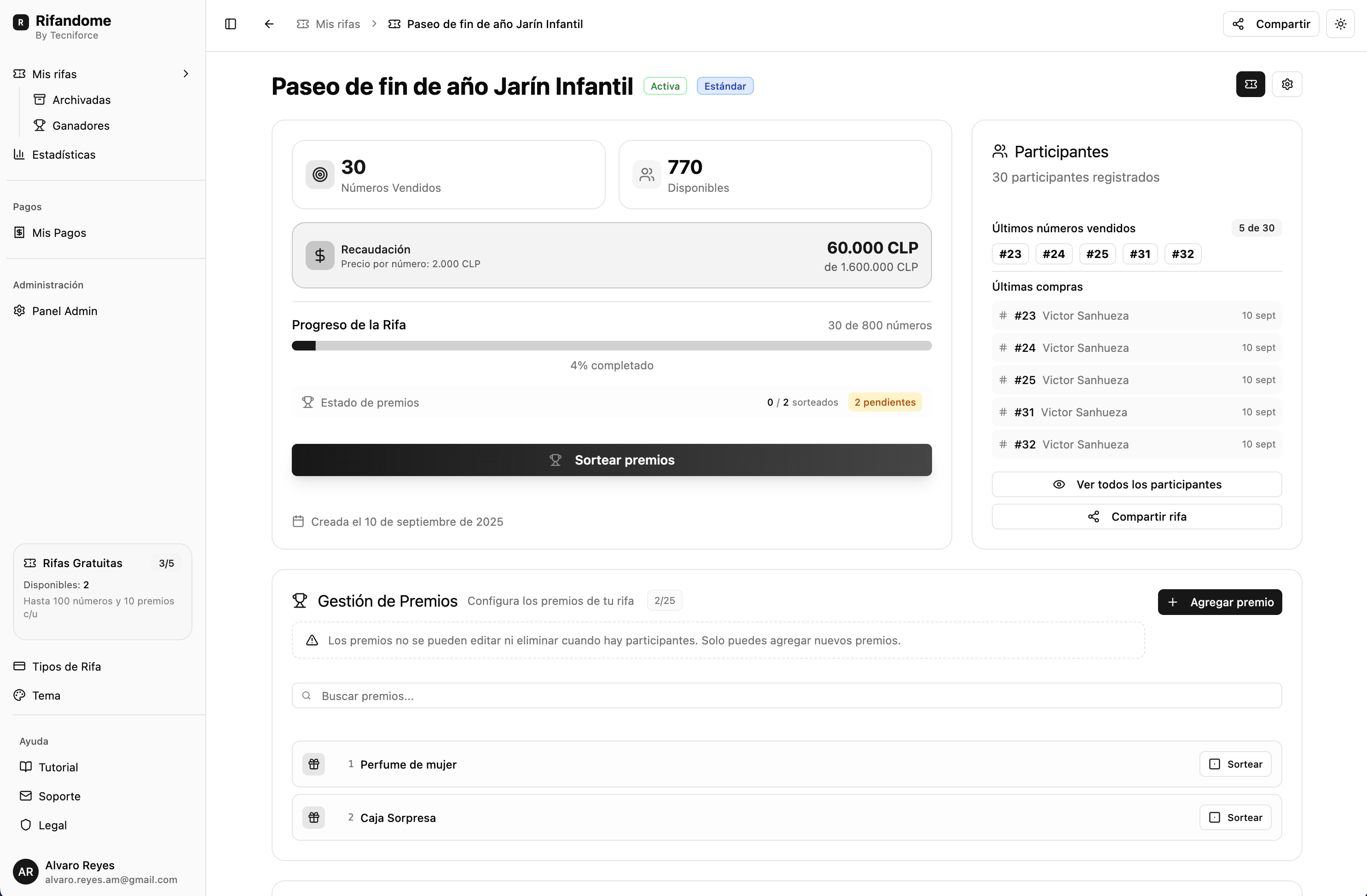 Todos los aspectos de tus rifas desde un panel centralizado: participantes, sorteos, premios y analíticas en un solo lugar.