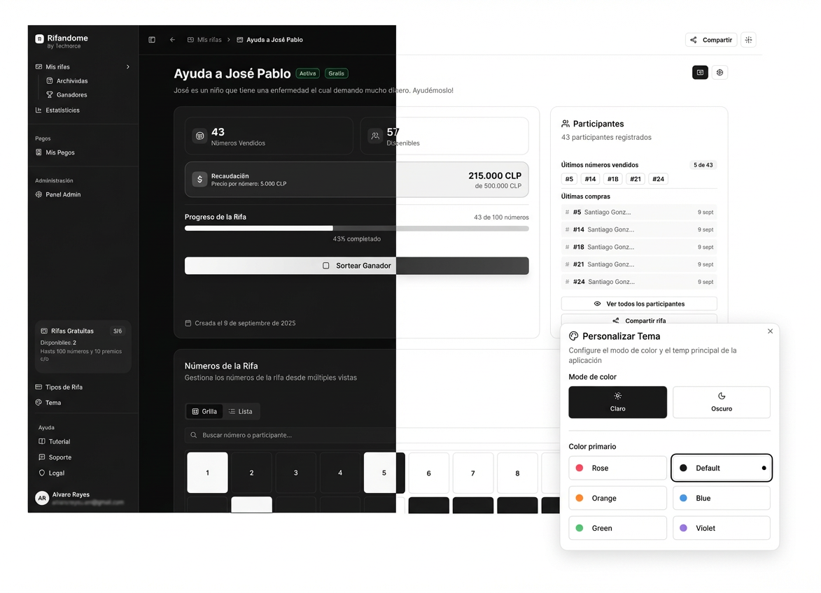 Elige entre 6 paletas de colores y un modo oscuro elegante para que tus rifas luzcan únicas y se adapten a tu identidad.